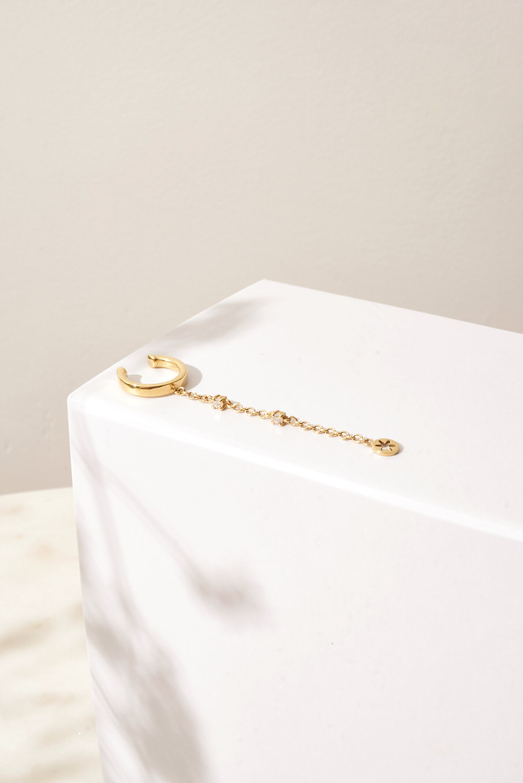diamantes talla brillante 0,07ct. El diámetro exterior es de 1,30cm/aprox y una cadenita con un largo de 4cm. Este modelo de pendiente es para llevar en la parte baja del helix de la oreja, es el piercing de moda, y la cadenita es para enfilar en el perno del pendiente por detrás de la oreja, antes del cierre presión. Un complemento original que te permitirá personalizar tu oreja. Puedes combinarlo con más criollas o con una discreta dormilona de brillante. Disponible también en oro blanco de 18k. El precio es para una unidad. Este modelo de ear cuff no es compatible